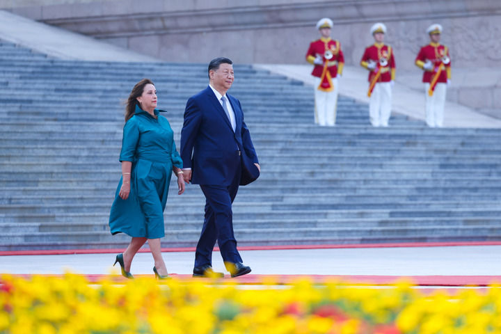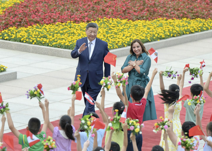 6月28日下午,国家主席习近平在北京人民大会堂同来华进行国事访问的秘鲁总统博鲁阿尔特举行会谈。这是会谈前,习近平在人民大会堂东门外广场为博鲁阿尔特举行欢迎仪式。新华社记者 刘彬 摄