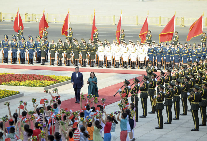 6月28日下午,国家主席习近平在北京人民大会堂同来华进行国事访问的秘鲁总统博鲁阿尔特举行会谈。这是会谈前,习近平在人民大会堂东门外广场为博鲁阿尔特举行欢迎仪式。新华社记者 高洁 摄
