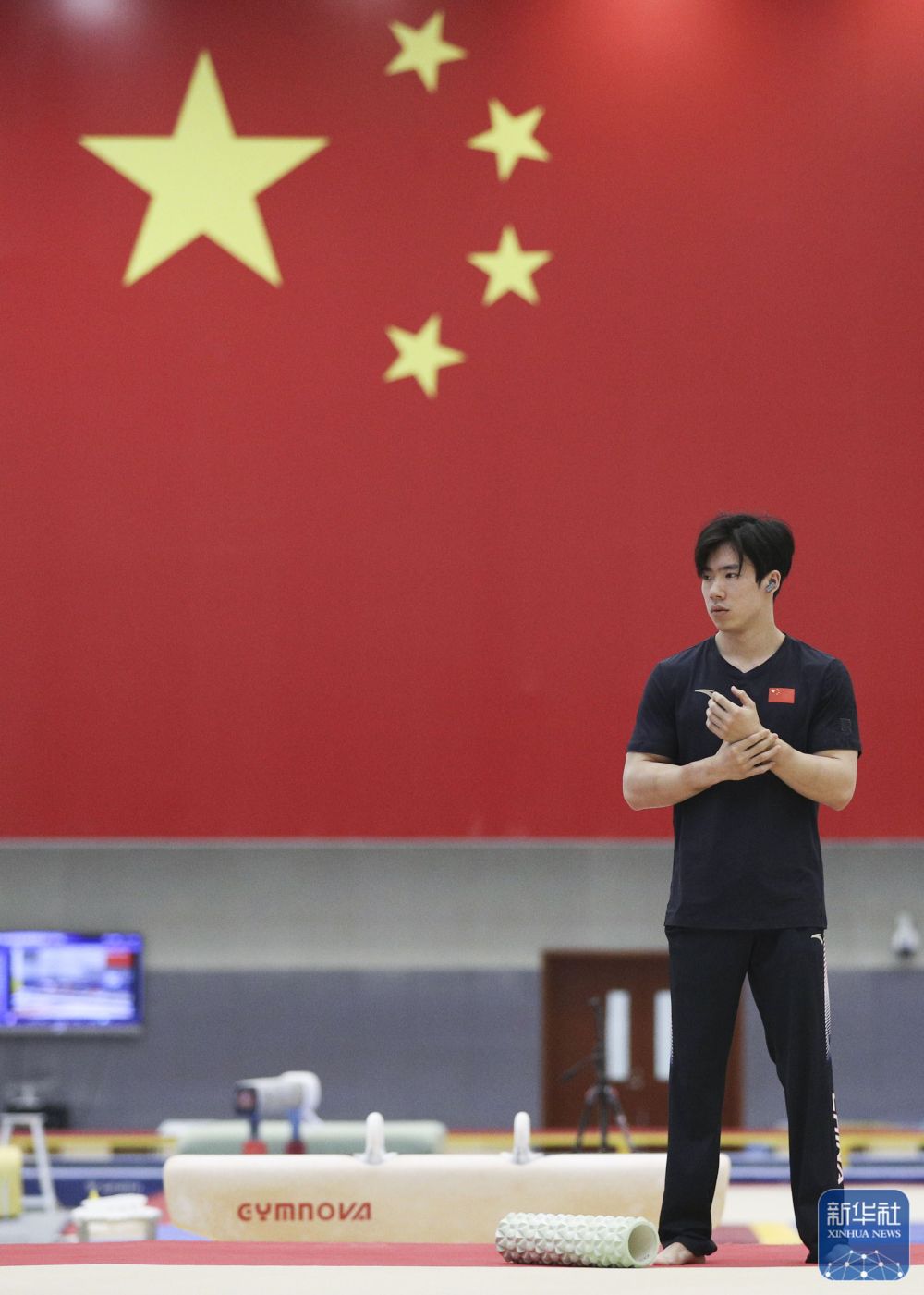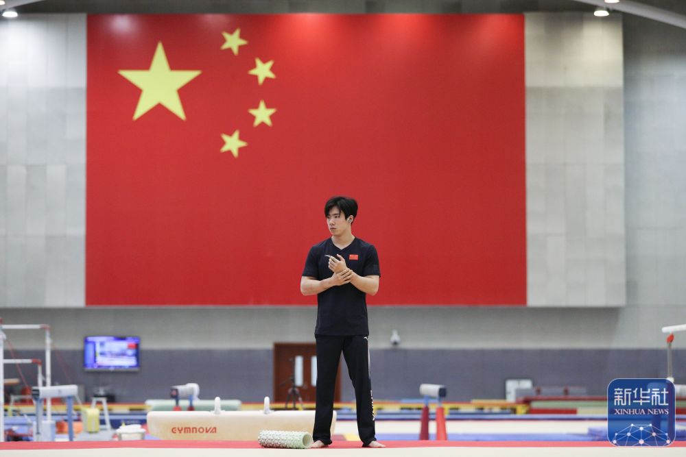 ↑中国体操队队员张博恒在训练前做准备。