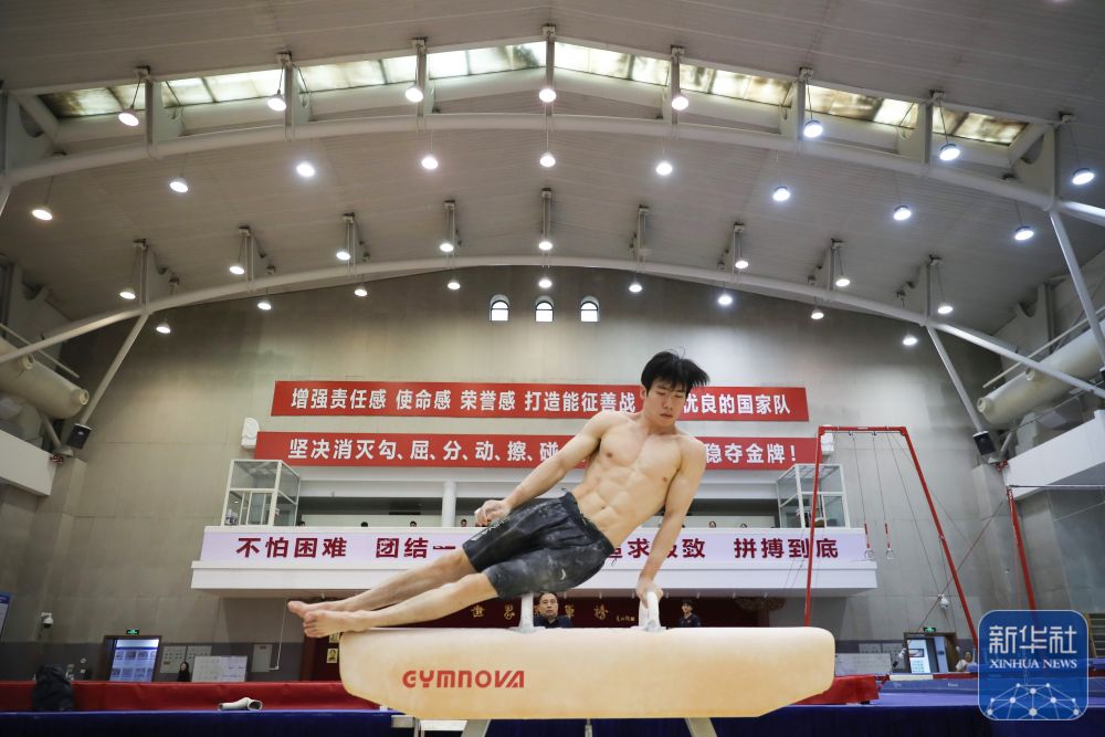 ↑中国体操队队员张博恒在训练中。