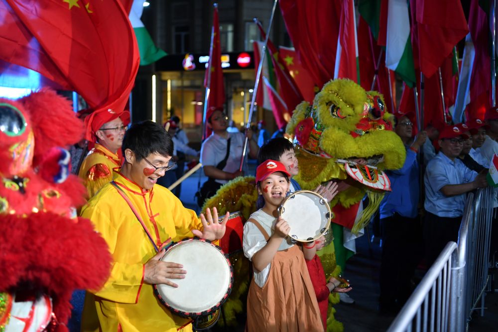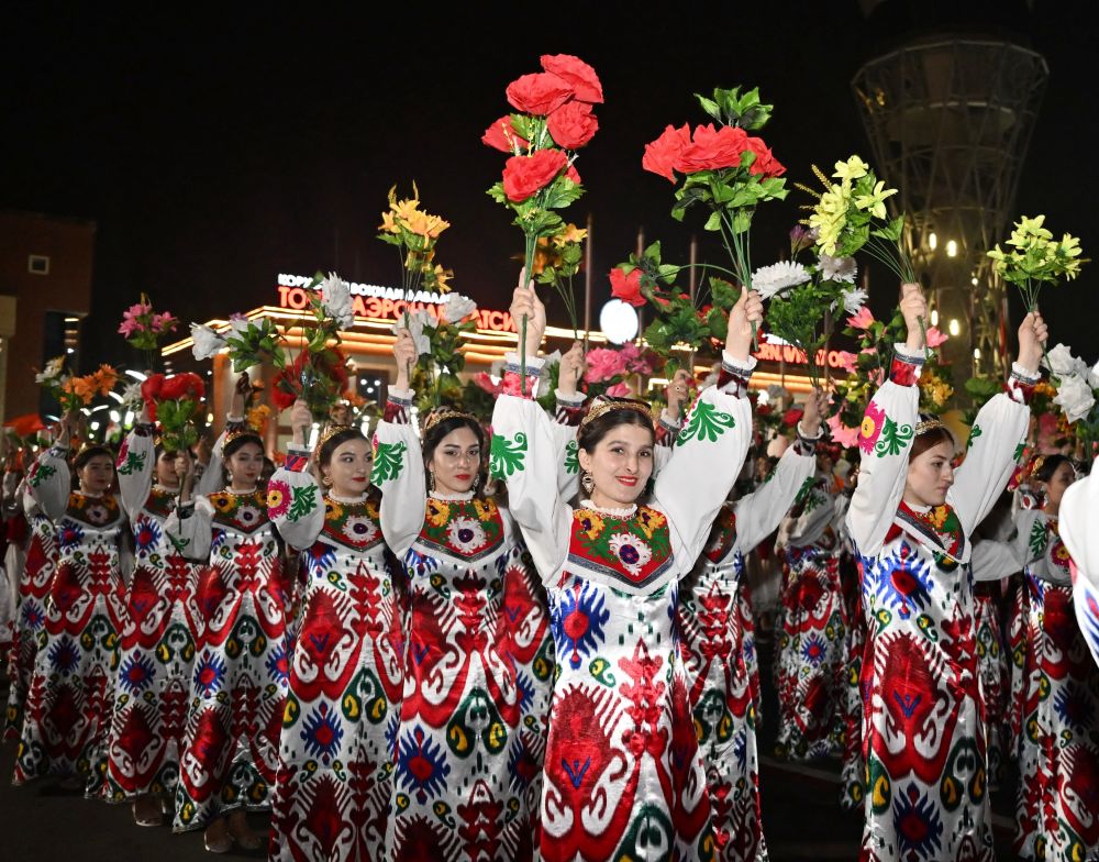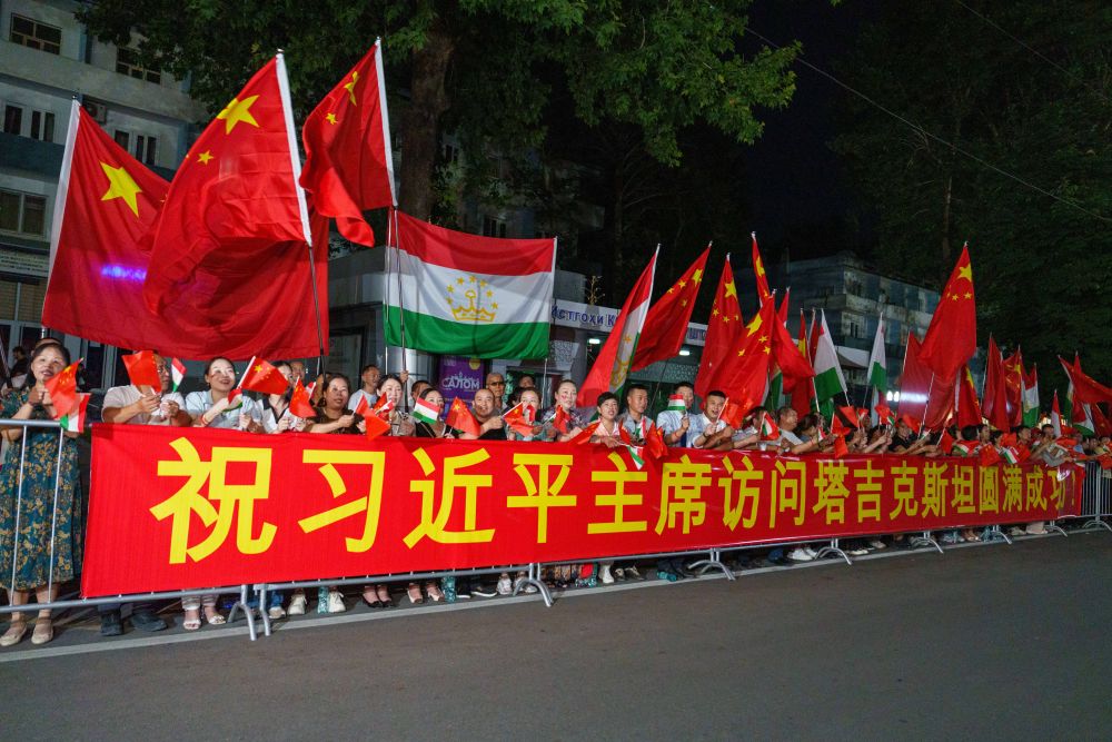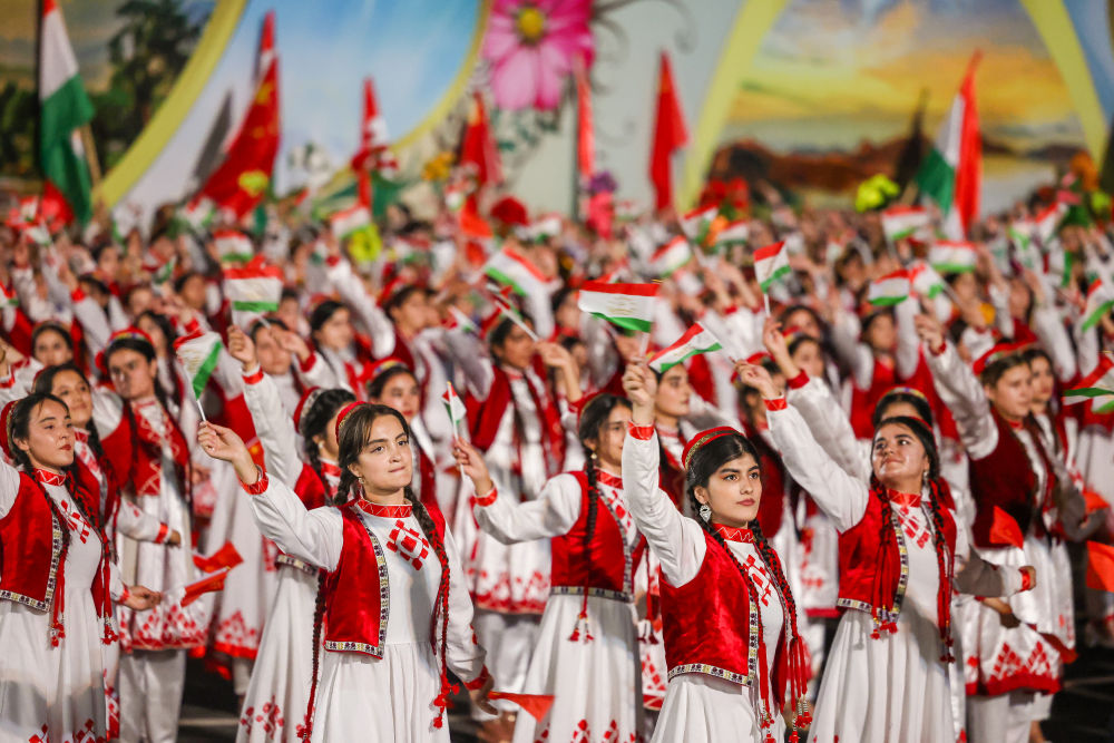 1500多名身着民族盛装的塔吉克斯坦青年表演富有浓郁特色的中塔歌舞,挥舞中塔两国国旗,表达对中国最尊贵客人的热烈欢迎。