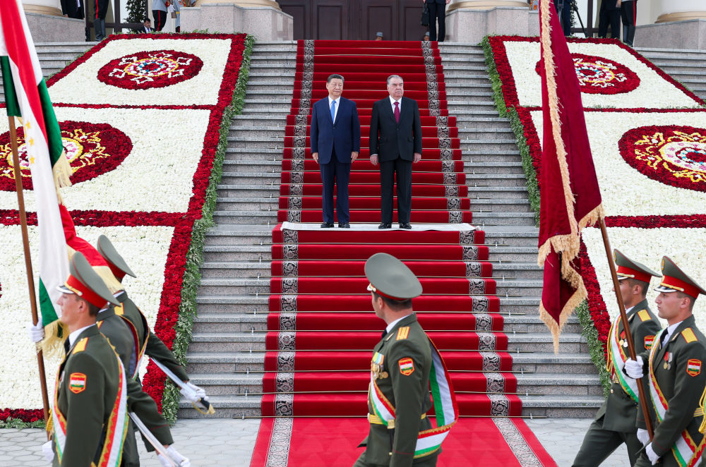 专机抵达杜尚别国际机场时,拉赫蒙率高级官员热情迎接。塔吉克斯坦儿童向习近平献花,用中、塔文欢迎习近平主席到访。两国元首在机场共同欣赏青年们表演的中塔歌舞。