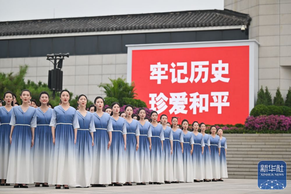 ↑ 7月7日,首都大学生合唱团在纪念全民族抗战爆发87周年仪式上演唱。