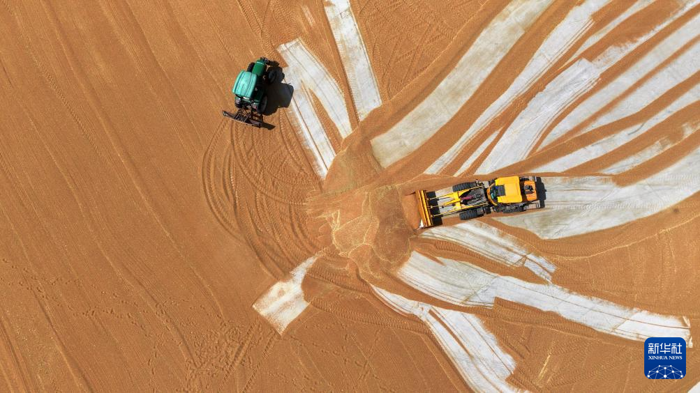 7月6日,宁夏贺兰县洪广镇农户在晾晒小麦(无人机照片)。新华社记者 王鹏 摄