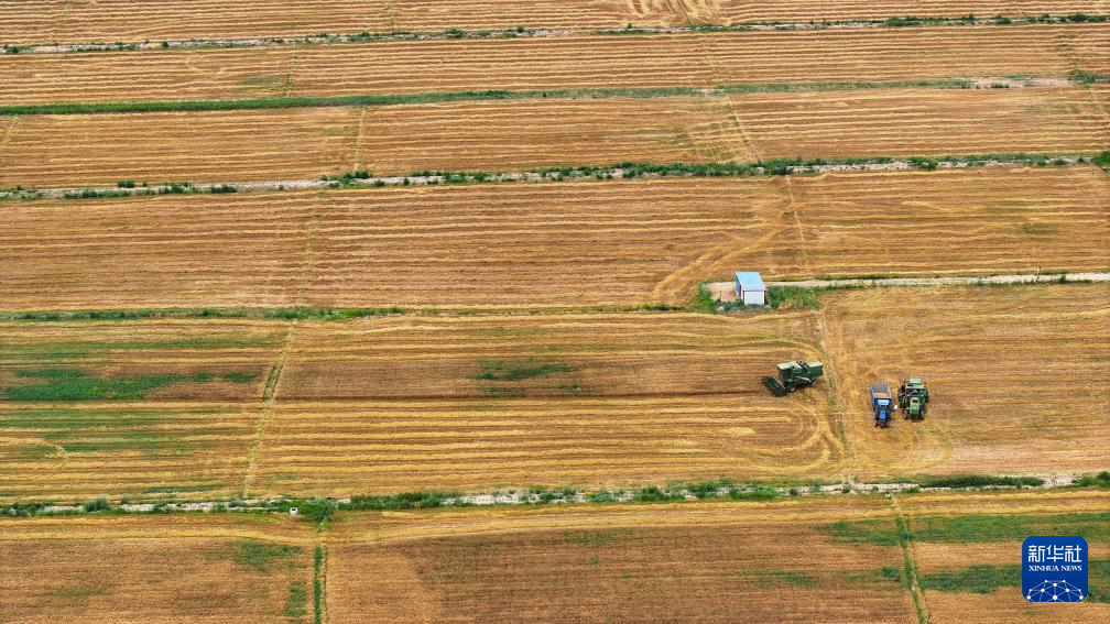7月6日,宁夏贺兰县洪广镇农户在田间收获小麦(无人机照片)。新华社记者 王鹏 摄