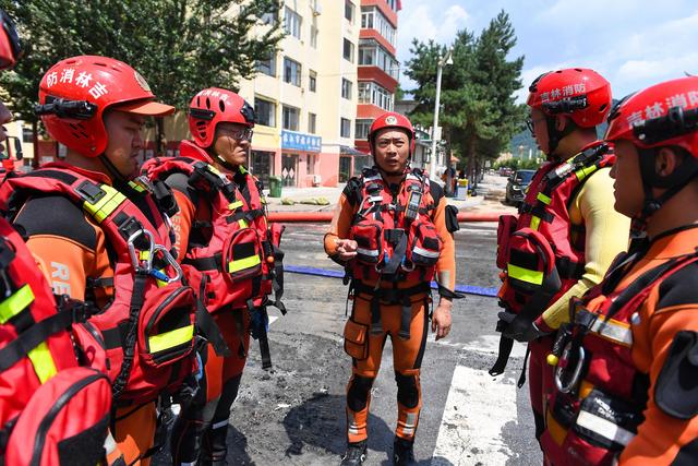 7月29日,在吉林省临江市,临江市消防救援大队世纪大街站副站长白云天(中)给队员布置任务。新华社记者 张楠 摄影报道