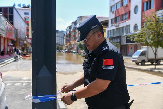 7月29日,在吉林省临江市,建国边境派出所所长赵旭烨在内涝区域路口设置警戒线。