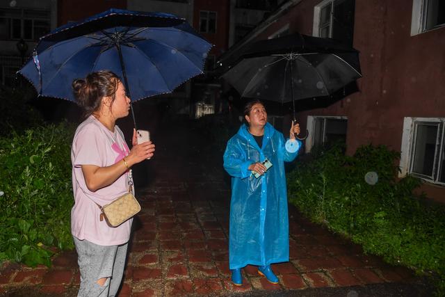 7月29日,在吉林省临江市,建国街道台兴社区党委书记孙爱武(右)和同事在怡景花园小区排查人员安置情况。