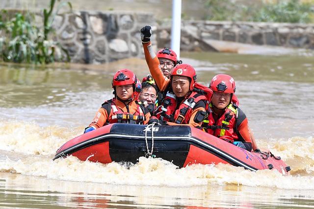 7月29日,在吉林省临江市,临江市消防救援大队世纪大街站副站长白云天(右二)在转运受困群众时,用手势指挥队员操控船只。