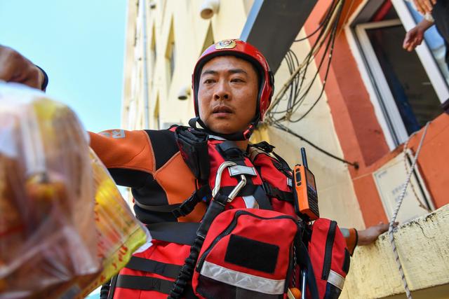 7月29日,在吉林省临江市,临江市消防救援大队世纪大街站副站长白云天为受困群众运送食品。