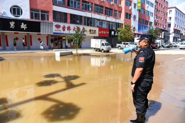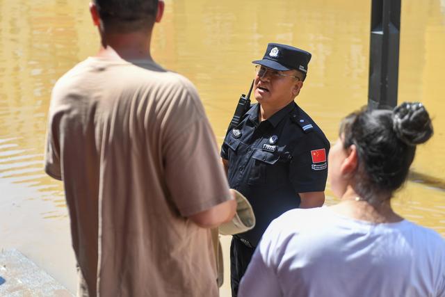 7月29日,在吉林省临江市,建国边境派出所所长赵旭烨劝导市民不要冒险涉水通行。