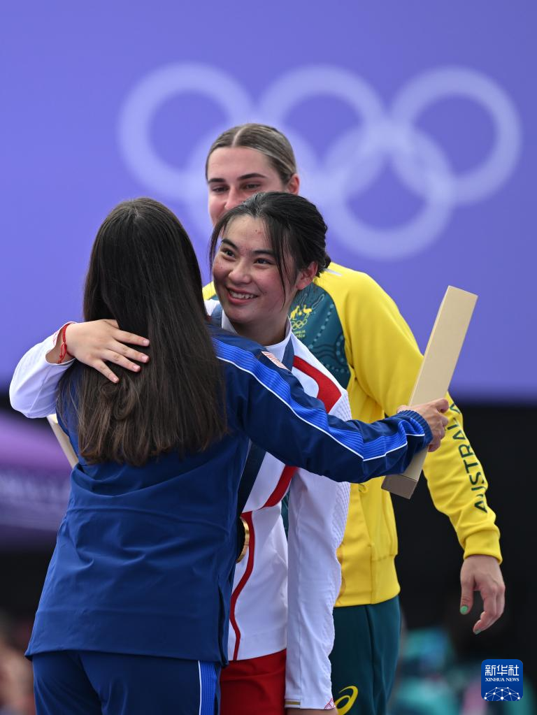 7月31日,冠军中国选手邓雅文(前右)和亚军美国选手贝内加斯(前左)在颁奖仪式上拥抱。新华社记者 胡虎虎 摄