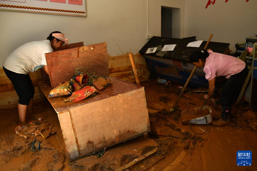 7月30日,在资兴市八面山瑶族乡青腰村,村民在清理淤泥和垃圾。新华社记者 陈振海 摄