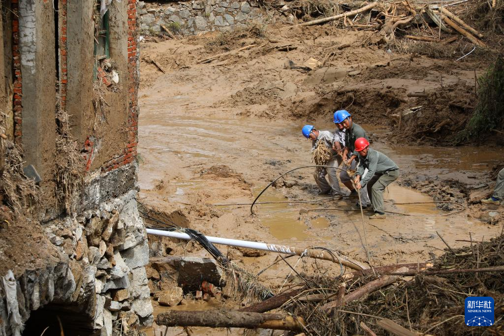 7月30日,在省道S344线何家山至八面山段,救援人员在抢通受阻道路。新华社记者 张格 摄