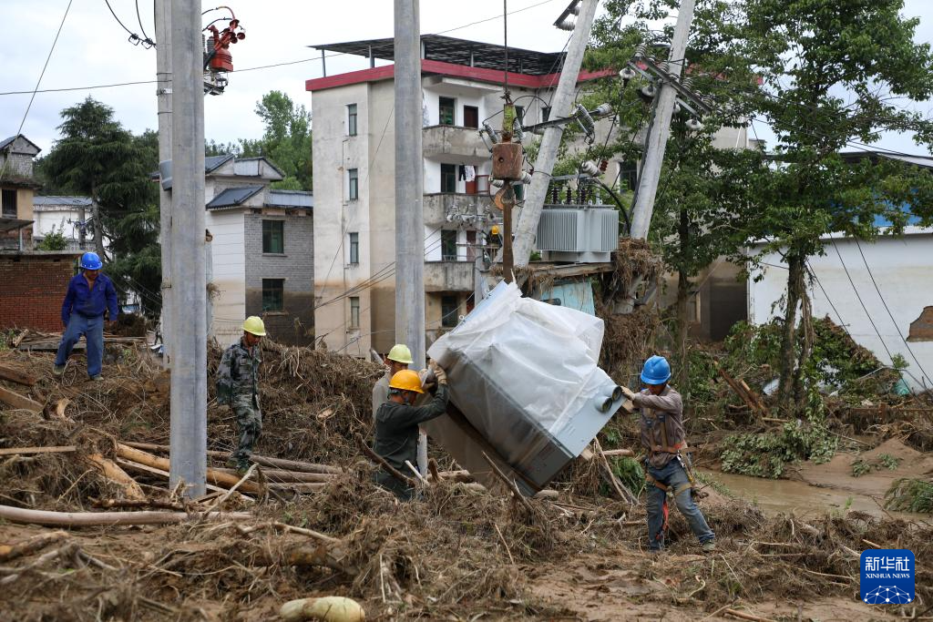 7月29日,在资兴市州门司镇,国网郴州供电公司工作人员在更换受损变压器和综合柜。新华社发(曹华斌 摄)