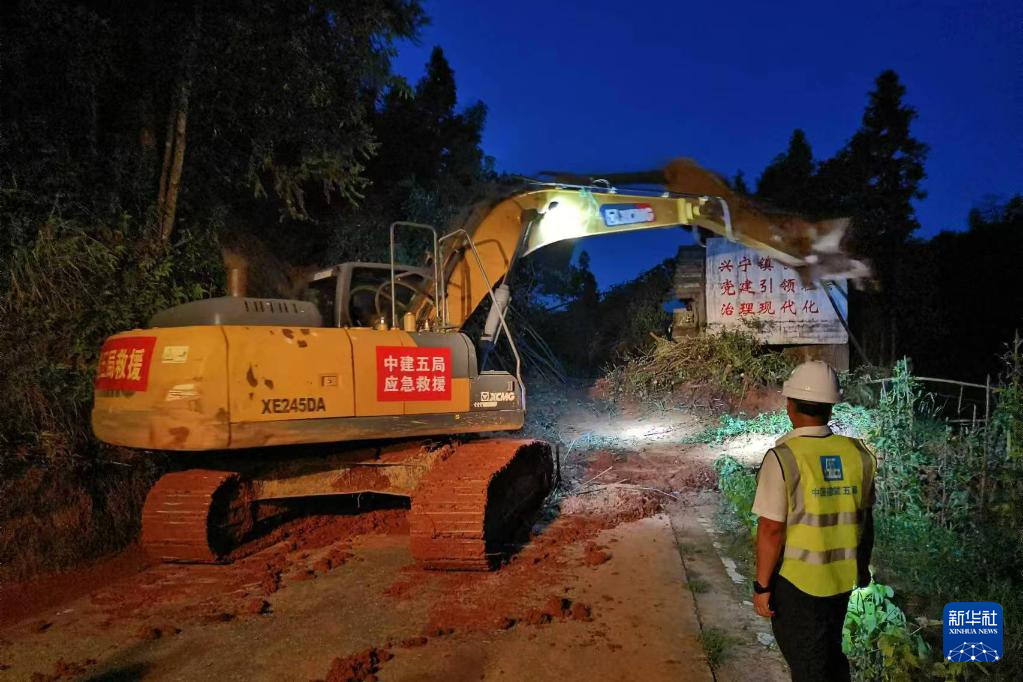 7月30日,在资兴市兴宁镇长坌村209乡道淤堵路段,中建五局应急救援队在抢修道路。 新华社发(李佳豪 摄)