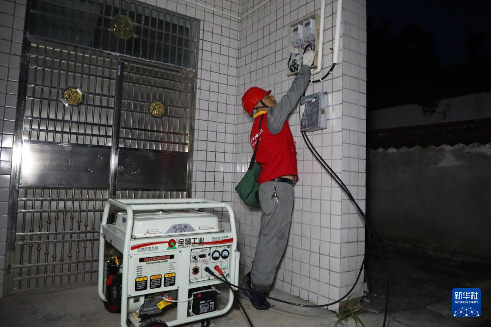 7月29日,在资兴市州门司镇白筱村,国网郴州供电公司工作人员将发电机电缆接通用户线路。新华社发(曹华斌 摄)