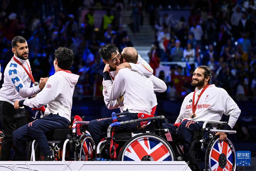 9月7日,冠军中国队选手田建全(右三)在颁奖仪式后和季军英国队选手皮尔斯拥抱庆祝。新华社记者 张豪夫 摄