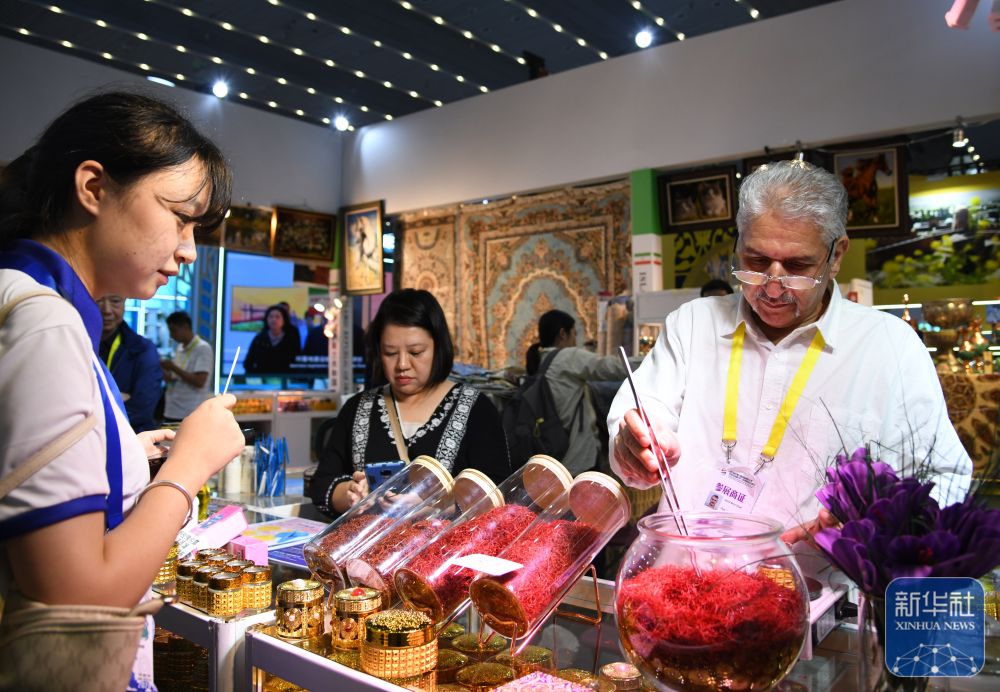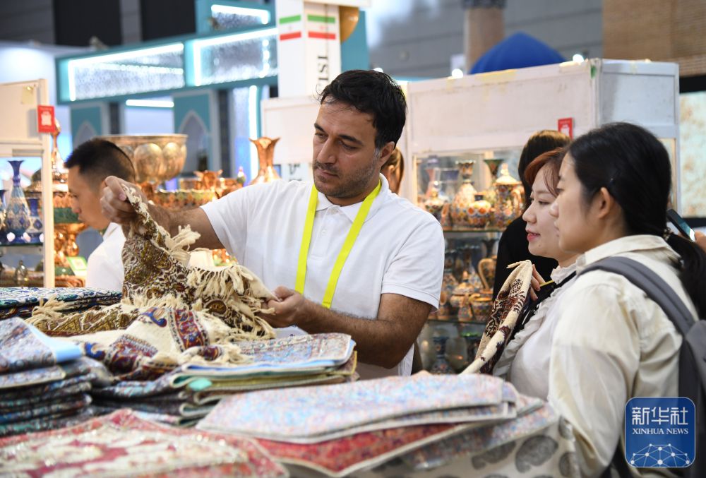 ↑9月20日,来自伊朗的参展商(左一)向观众介绍产品。