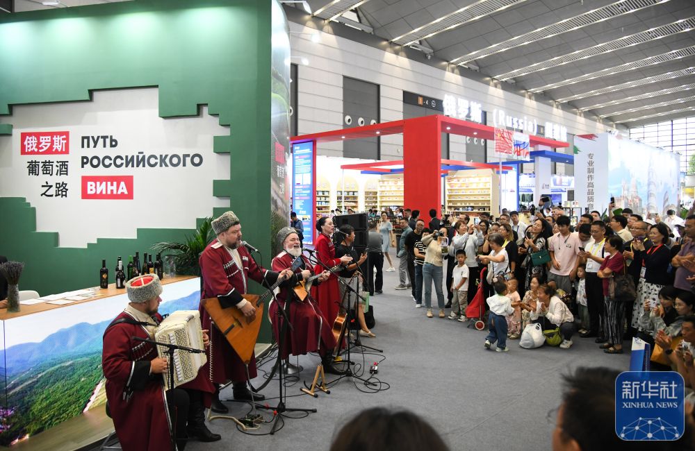 ↑9月20日,观众在博览会现场欣赏俄罗斯乐队演出。
