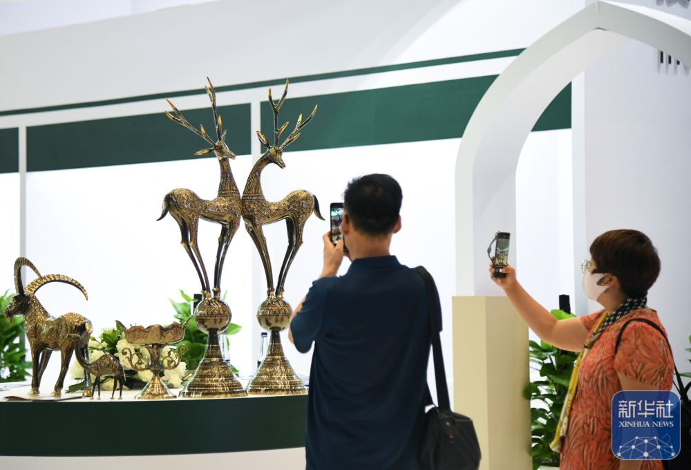 ↑9月20日,观众在巴基斯坦展位参观工艺品。