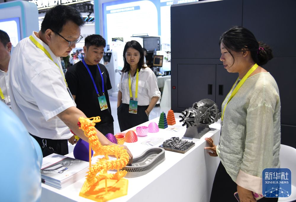 ↑9月20日,观众在博览会现场了解3D打印产品。