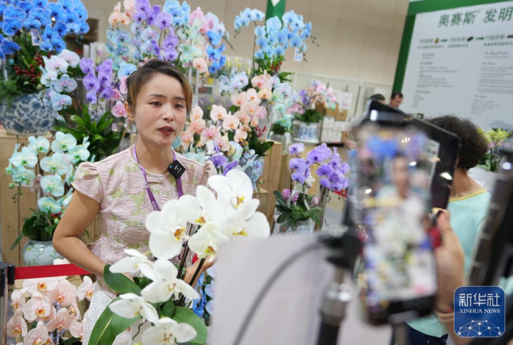 ↑ 9月20日,一名主播在第二十二届中国昆明国际花卉展上直播销售。