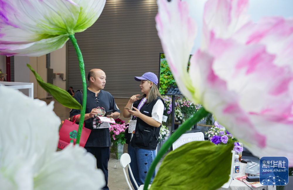 ↑ 9月20日,参观者(左)和参展商在第二十二届中国昆明国际花卉展上洽谈合作。