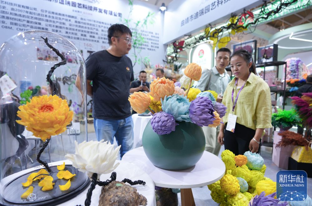 ↑ 9月20日,参观者在第二十二届中国昆明国际花卉展上观看一家企业的永生花。