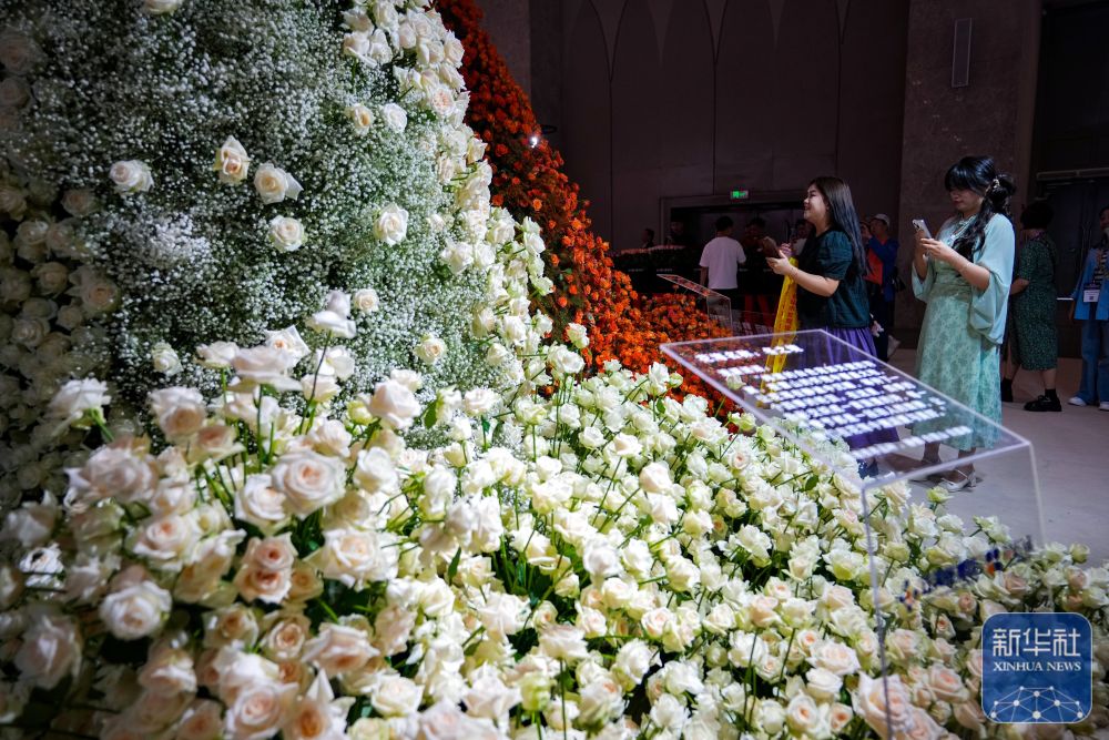 ↑ 9月20日,参观者在第二十二届中国昆明国际花卉展一个花艺装置前拍照。