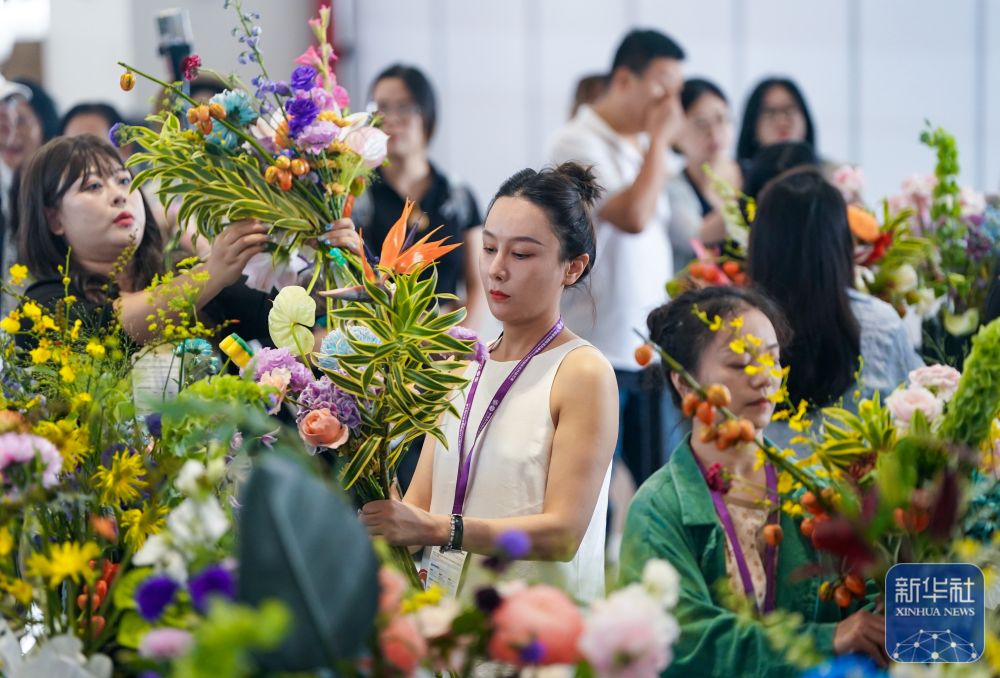 ↑ 9月20日,参赛选手在第二十二届中国昆明国际花卉展花礼创意大赛上制作花束。