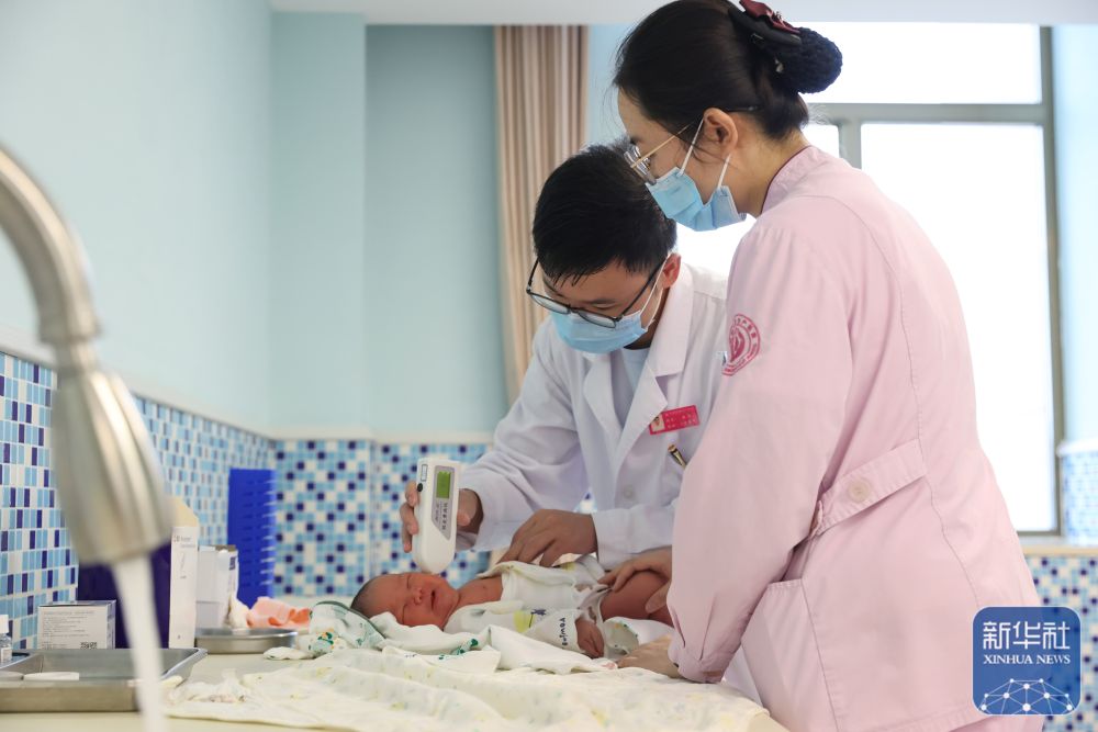 10月1日,江苏无锡怡和妇产医院的医护人员为新生儿进行黄疸检测。新华社发(朱吉鹏摄)