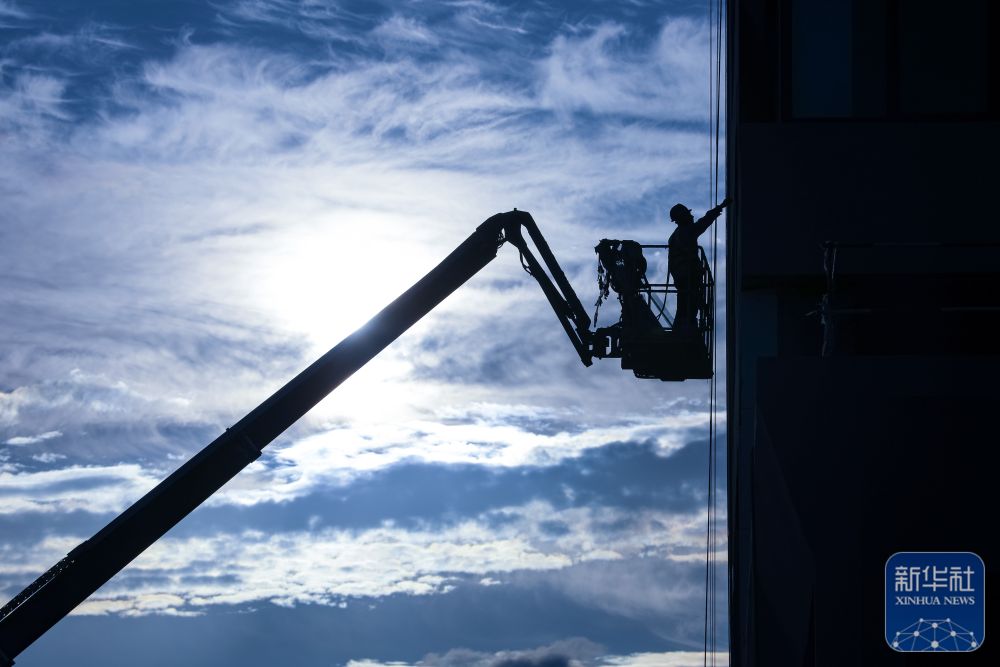 10月1日,在山东省青岛市李沧区一项目施工现场,工人进行外墙施工作业。新华社发(张鹰摄)