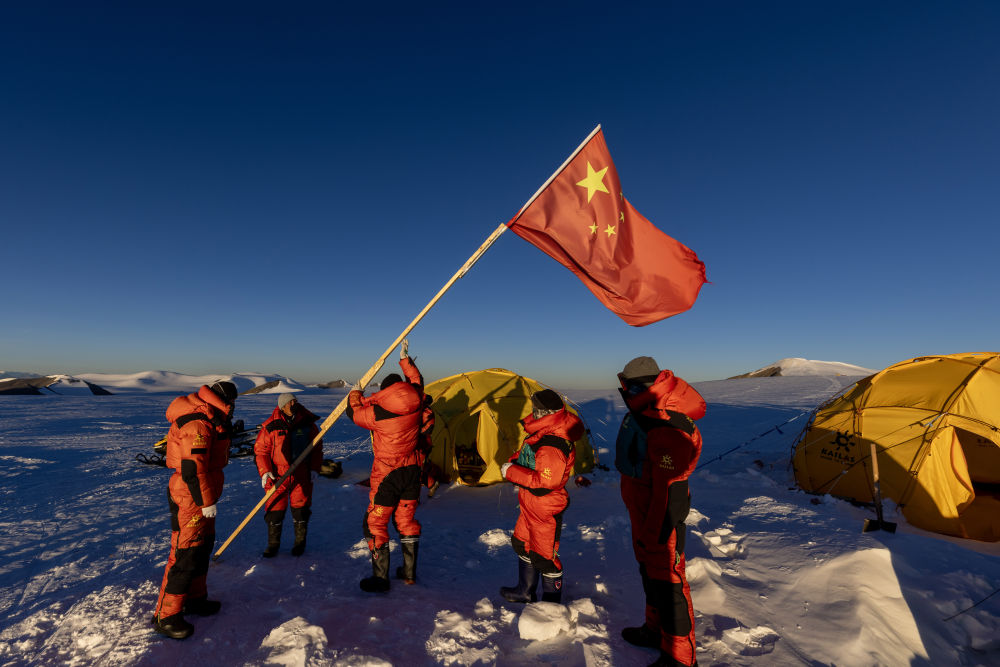 10月1日清晨,第二次青藏科考队普若岗日冰原冰芯钻取与冰面过程科考小组队员在营地安插国旗。新华社记者 姜帆 摄