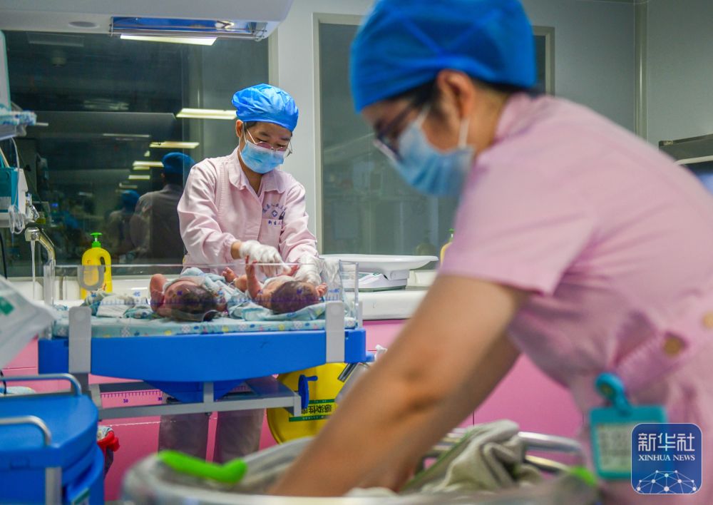 10月1日,在湖南省永州市道县人民医院新生儿科,护士在给新生儿做护理。新华社发(蒋克青摄)