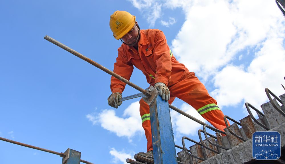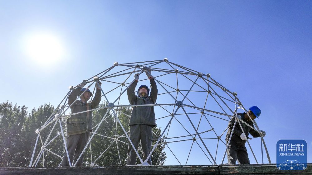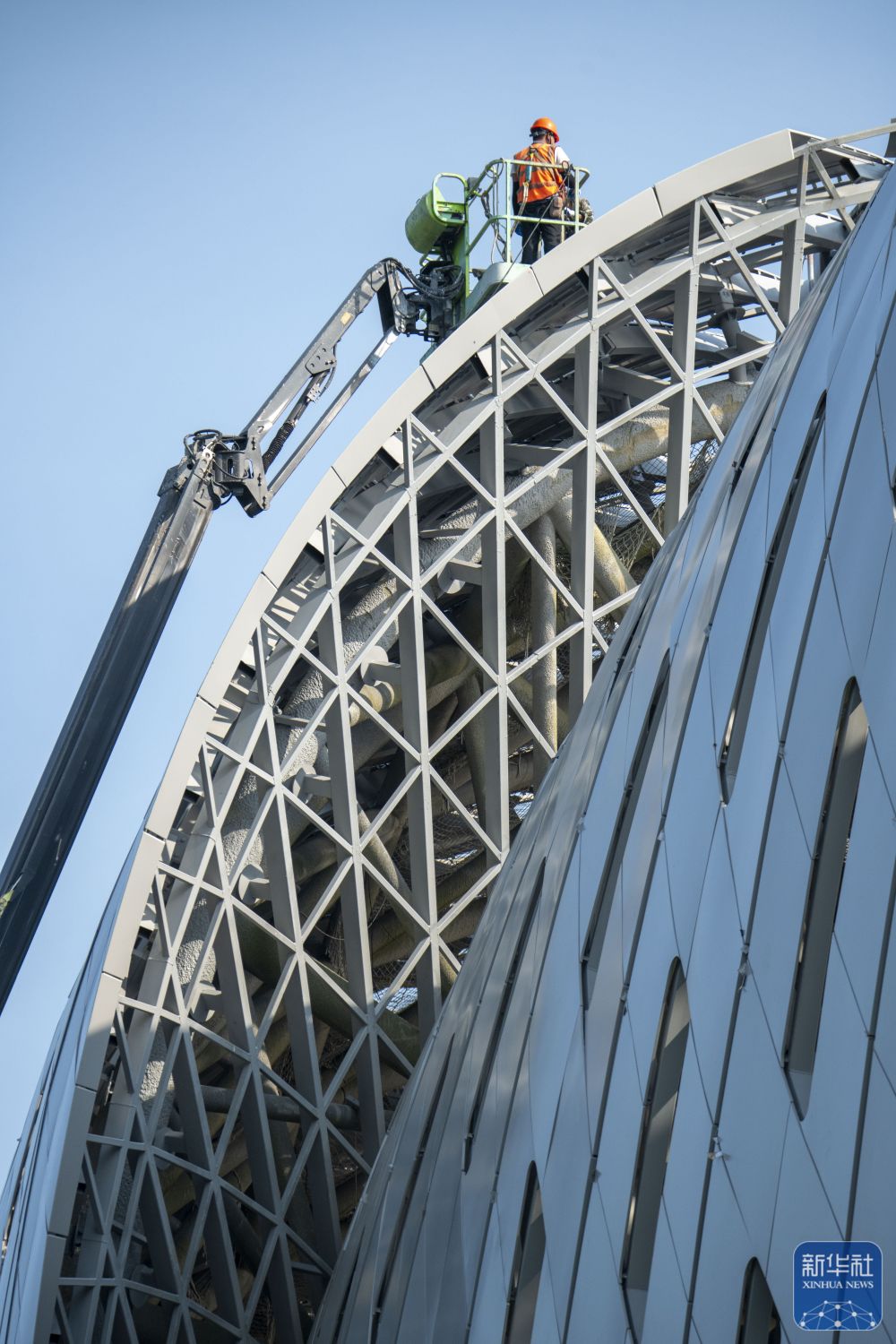 10月1日,海南省琼海市建设工人在文体中心穹顶外围施工。新华社发(蒙钟德摄)