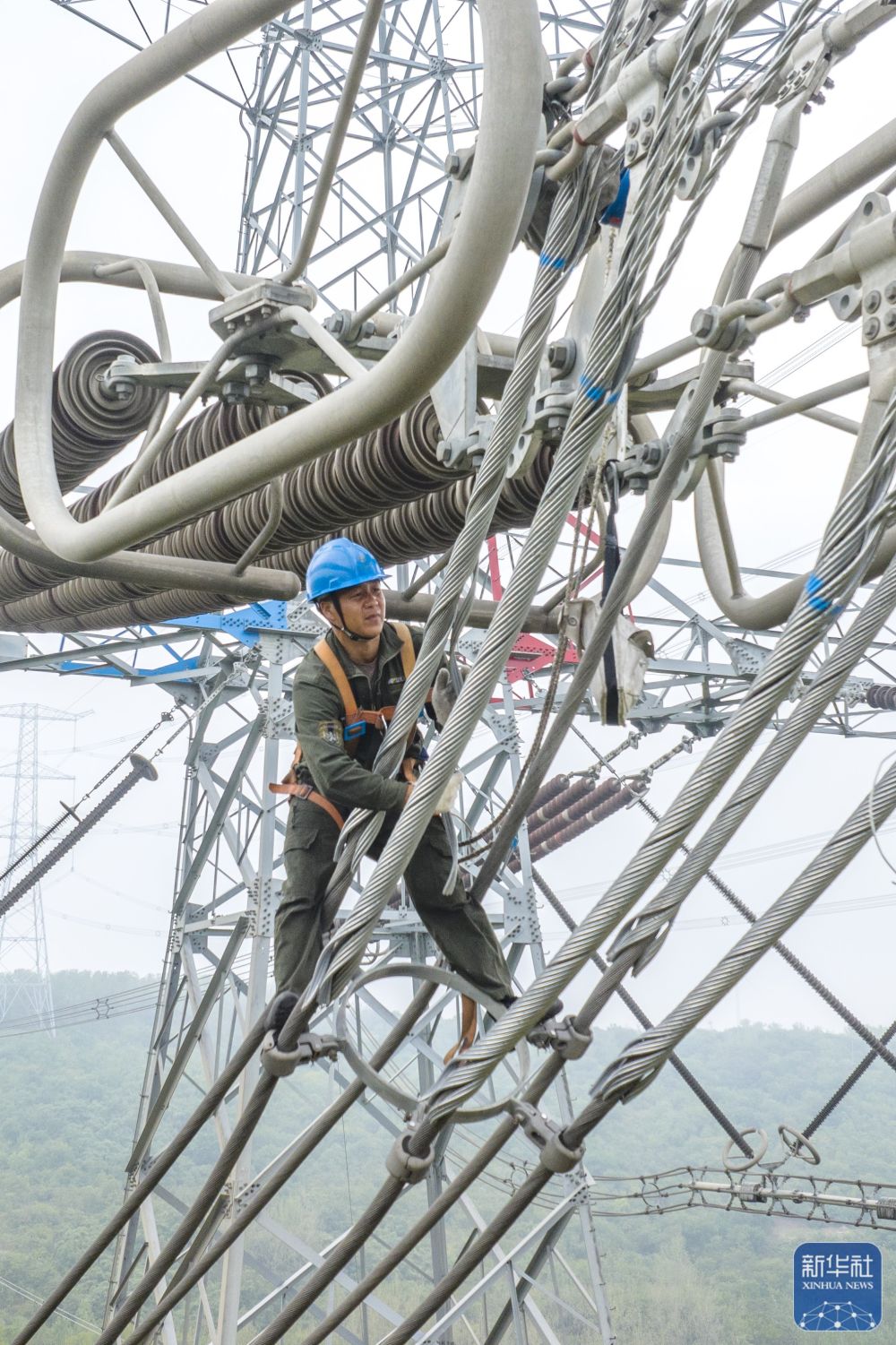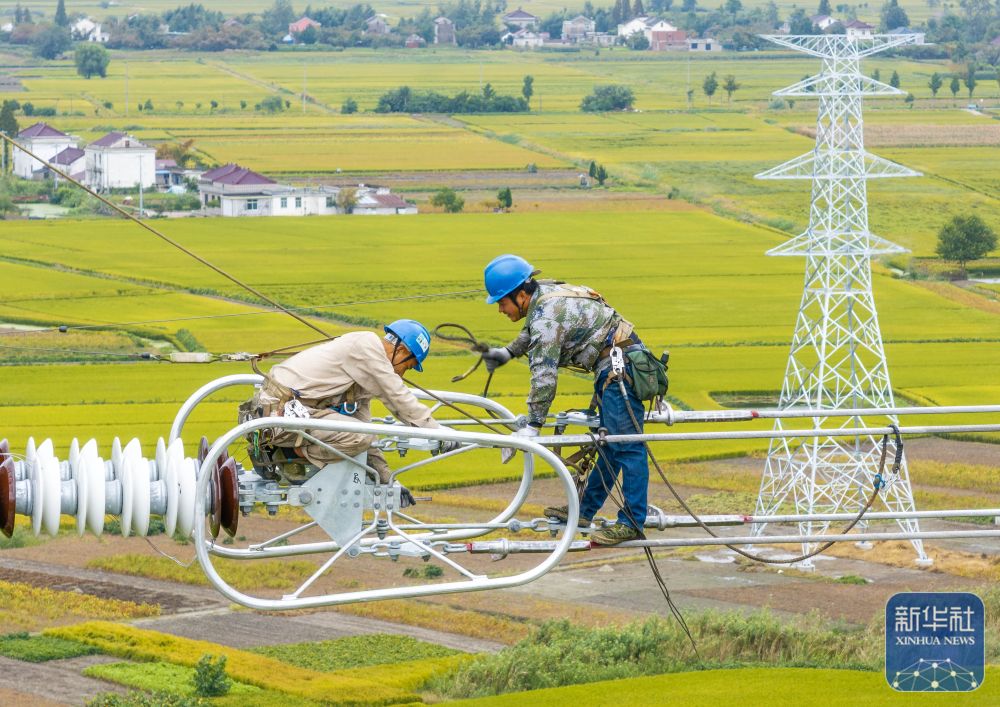 10月1日,检修人员在江苏省淮安市的±800千伏雁门关—淮安特高压直流输电线路检修现场工作(无人机照片)。新华社发(史俊摄)