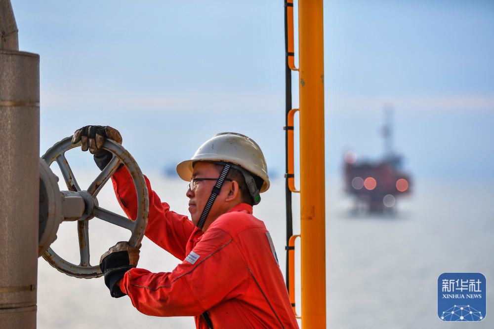 10月1日,在渤海油田海上作业平台,工人进行生产流程调整。新华社发(杜鹏辉摄)