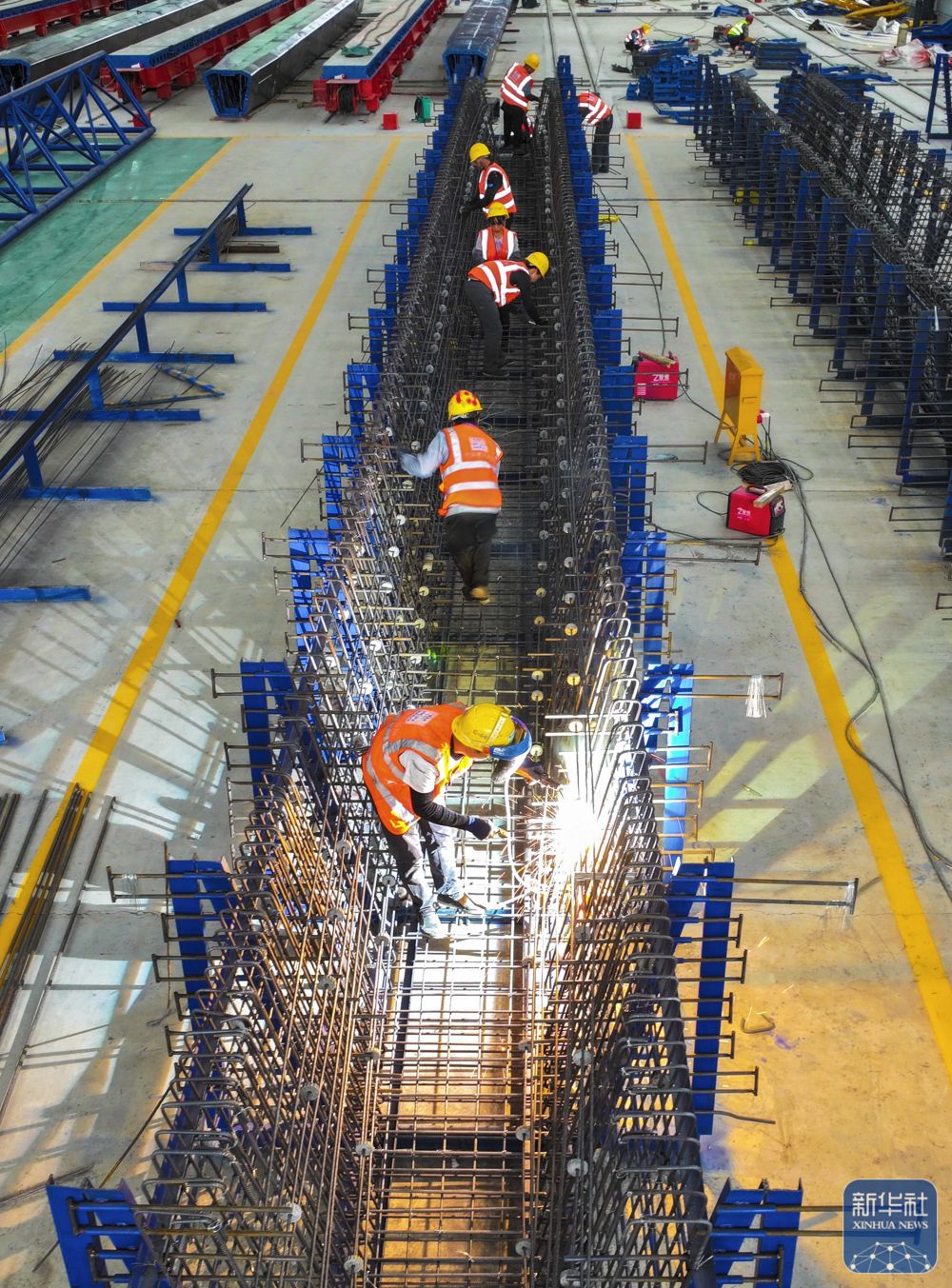 10月1日,在位于湖南省永州市双牌县境内的零(陵)道(县)高速公路第四合同段智慧梁场,中建五局的工人们在施工(无人机照片)。新华社发(周秀鱼春摄)