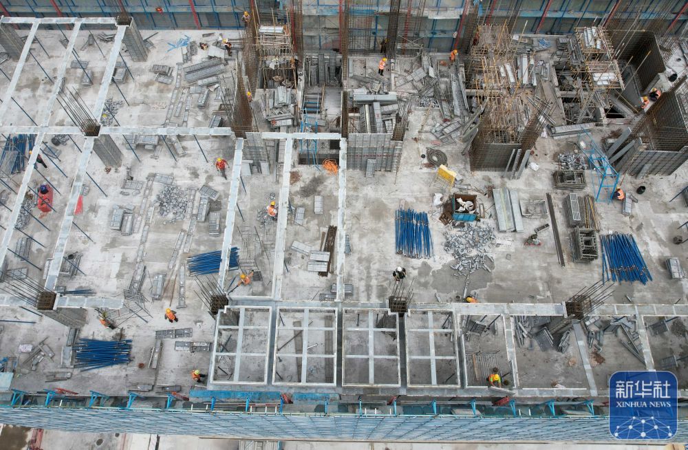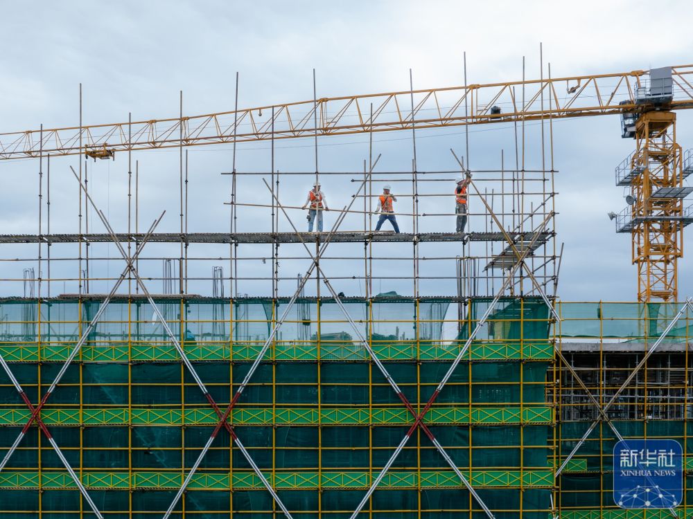 10月1日,浙江省永康市石柱高新科技产业园项目建设施工现场,工人在搭建外立面脚手架(无人机照片)。新华社发(韩东儒摄)