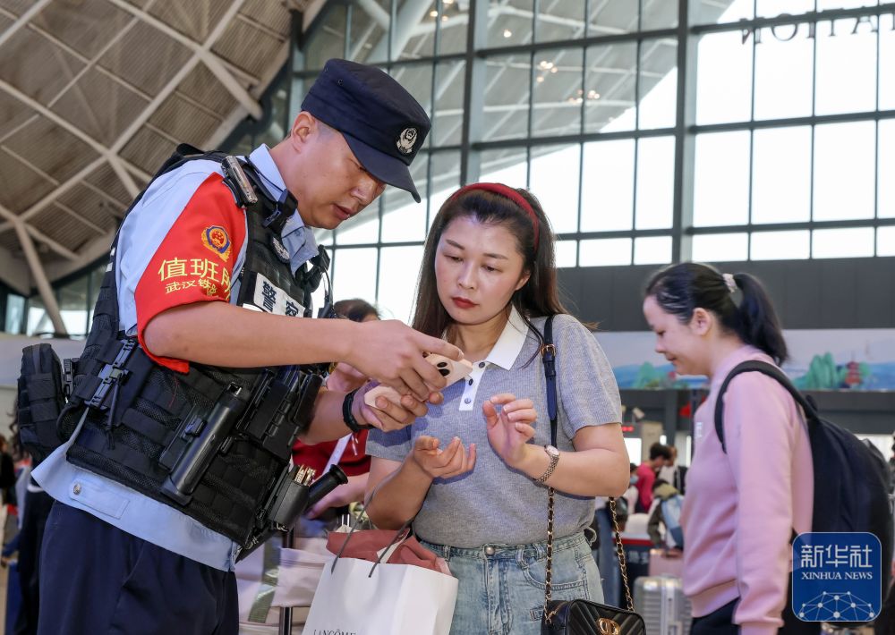 10月1日,湖北省武汉火车站派出所民警为旅客乘车提供服务。新华社发(赵军摄)