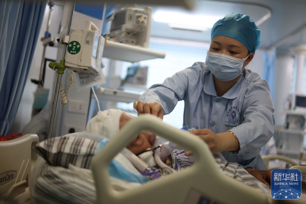 10月1日,湖南省邵阳市城步苗族自治县人民医院,重症室的医师给病人做辅助呼吸治疗。新华社发(严钦龙摄)