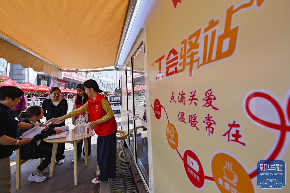 10月1日,在山东省青州市一处景点,移动工会驿站的志愿者为游客服务。新华社发(王继林摄)