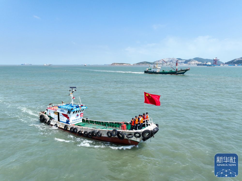 10月1日,浙江省舟山市岱山县公安局罗家岙派出所民警辅警乘坐“红帆110”船只开展海上巡查(无人机照片)。新华社发(邹训永摄)