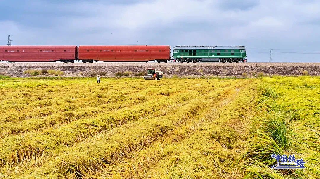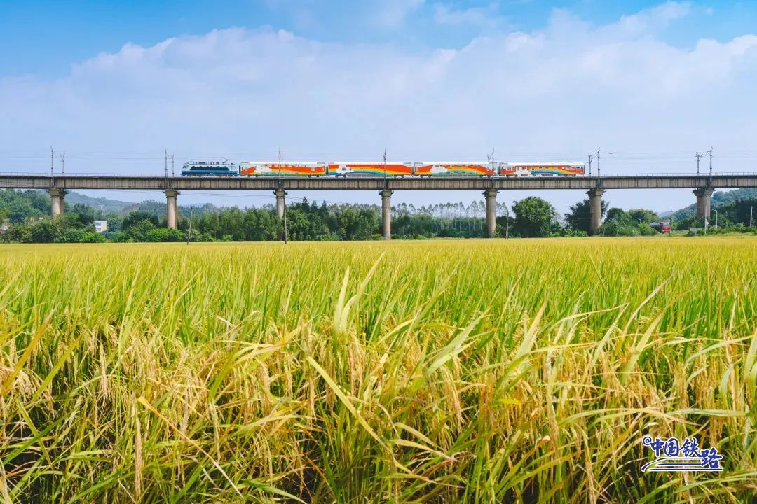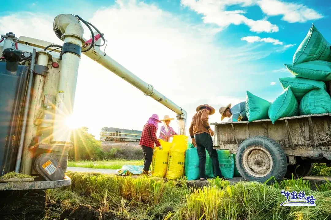 漳龙线上的列车从夕阳下驶过,线路旁的稻田迎来丰收。黎家豪 摄