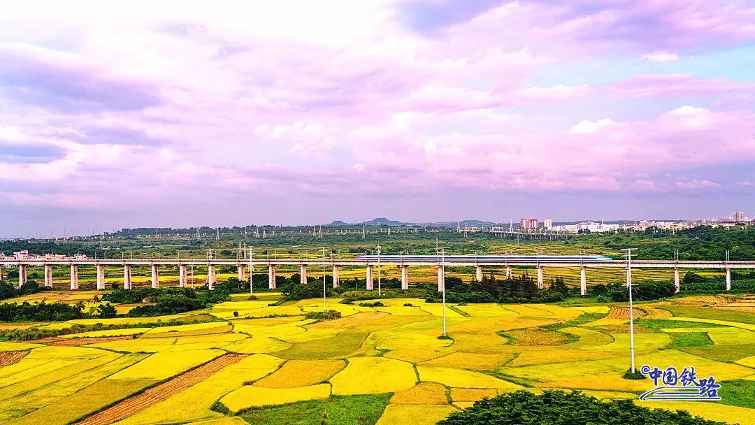 杭深高铁上飞驰的紫色复兴号经过一片金色稻田。吕杰琛 摄