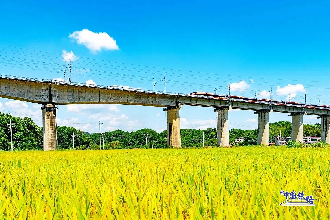 怀衡高铁上疾驰的复兴号与金黄的稻田同框。李小平 摄