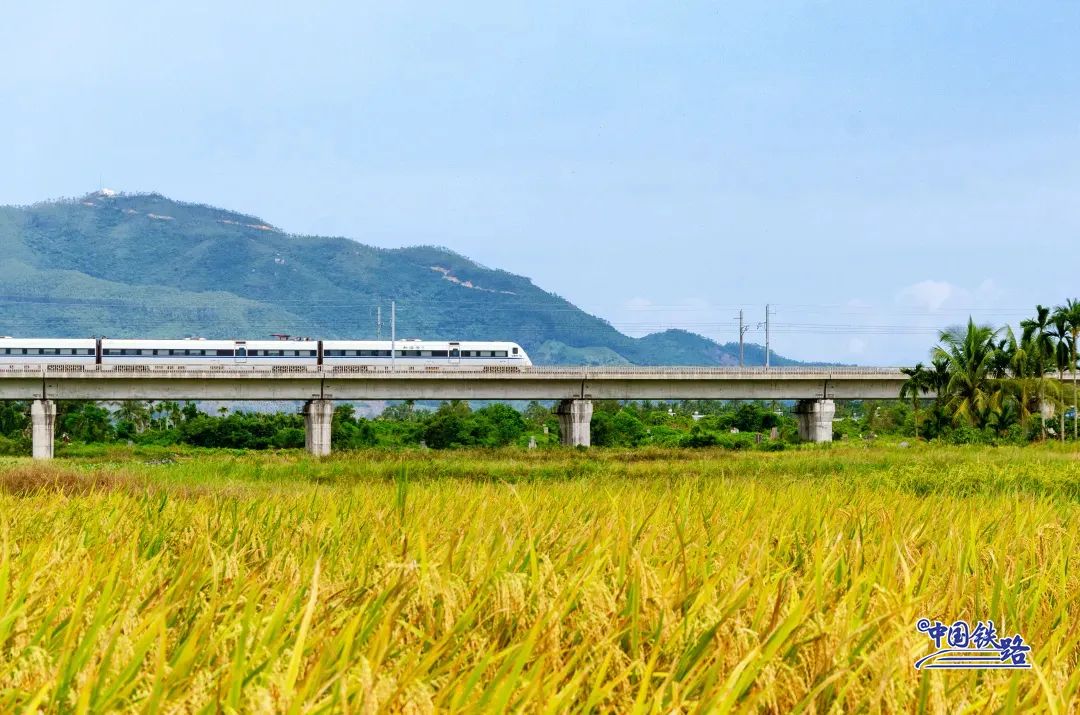 海南环岛高铁上疾驰而过的复兴号与稻田同框。蔡晶 摄
