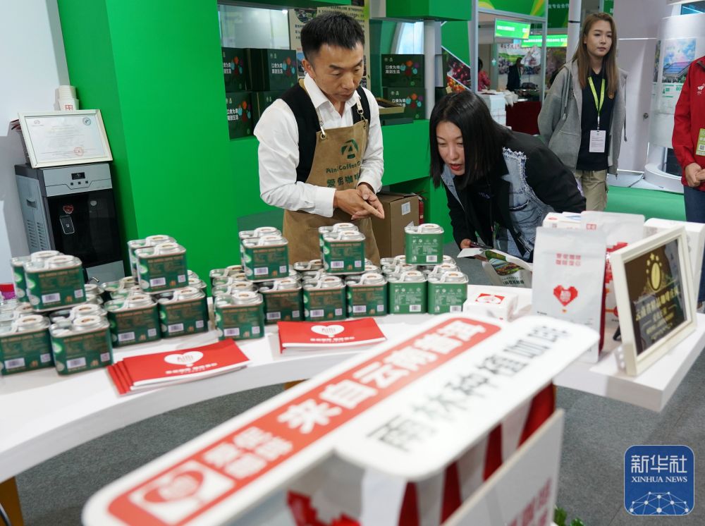 ↑10月11日,参观者在世界农业科技博览会现场了解来自云南的咖啡。