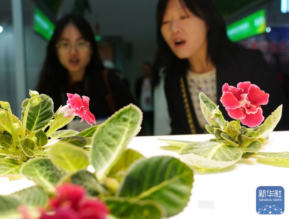 ↑参观者在世界农业科技博览会现场了解无土水培技术(10月11日摄)。